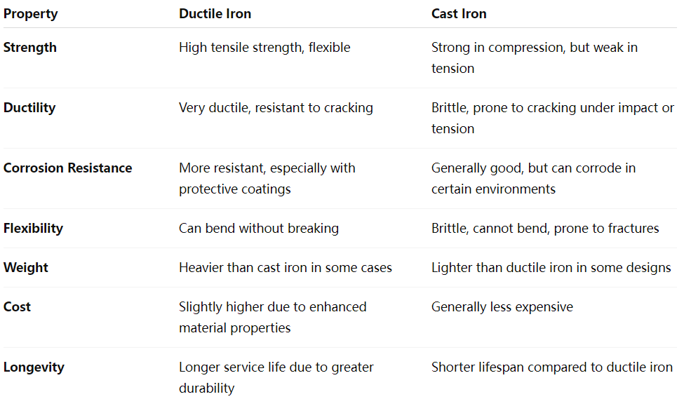 Lakas: Ang ductile iron ay may higit na lakas ng makunat na lakas at paglaban sa epekto kumpara sa cast iron, na ginagawang mas matibay sa mapaghamong mga kapaligiran.